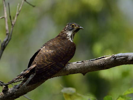 Large hawk-cuckoo (Hierococcyx sparverioides) the eagle hawk with yellow eye rings perching on the tree showing its back feathers profile