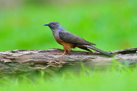 Beautiful bird, male of Large Hawk Cuckoo (Hierococcyx sparverioides) on green grass, Bird from Thailand