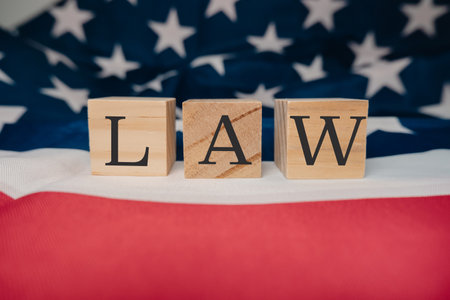 A wooden block with the word law written on it. The block is placed on top of a red and white American flag. The flag is spread out, covering a large portion of the background