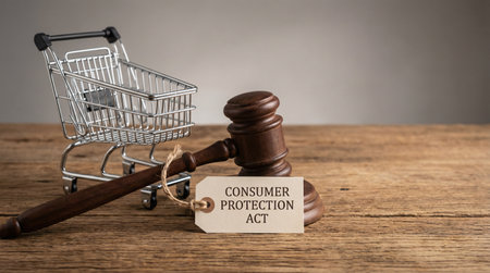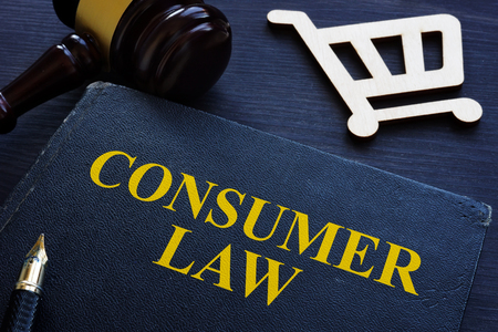 Consumer law, gavel and shopping cart on a desk.