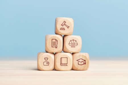 Concept of the system of work of court and justice on a pyramid of wooden blocks.