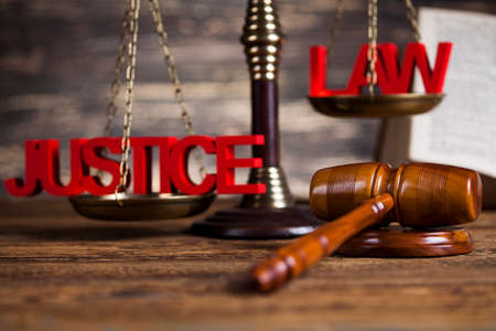 Law theme, mallet of the judge, justice scale, wooden desk background