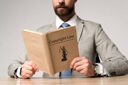 partial view of lawyer reading book with copyright law title isolated on grey