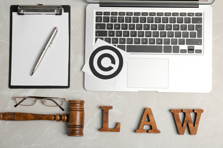Flat lay composition with clipboard, gavel and laptop on gray background. Copyright law concept