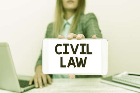 Conceptual display Civil Law. Word for Law concerned with private relations between members of community Financial Advisor Giving Money Saving Tips, Entrepreneur Discussing Deals