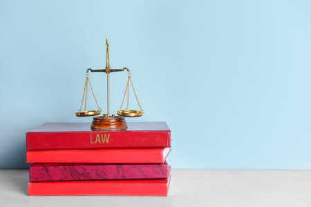 Scales of justice and books on table