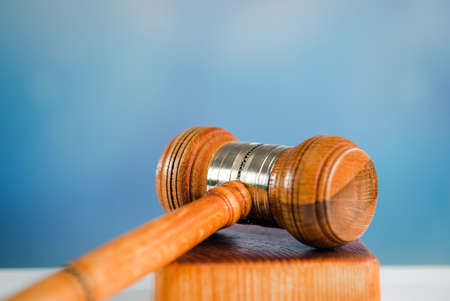 Judges wooden gavel, on wooden table background