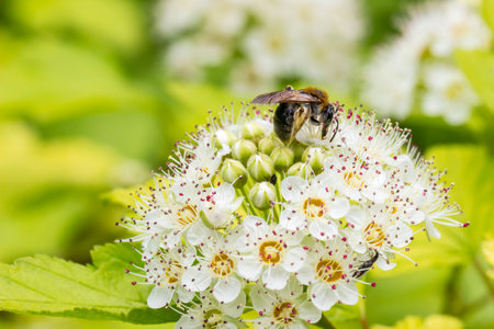 Close up of Spring Flowering Spireas Spiraea betulifolia. Tor spirea with white bloom. White bloom Shrub.