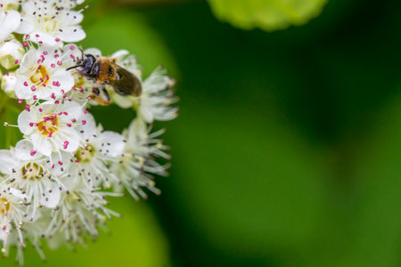 Blooming Physocarpus opulifolius bush in the garden, closeup