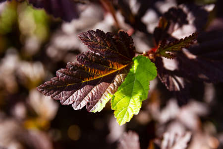 Physocarpus opulifolius diabolo or ninebark foliage, close up, selective focus. Beautiful botany background.