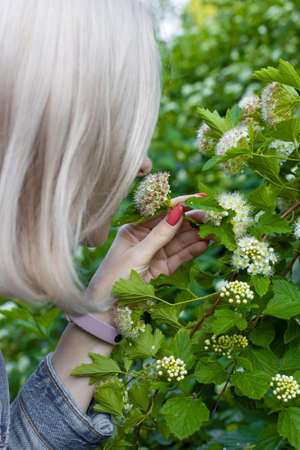 Close-up branch with bunches of summer garden white flowers of guelder rose
