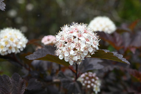 Flowers of an ornamental garden shrub of Vine-leaved spirea with dark burgundy leaves.