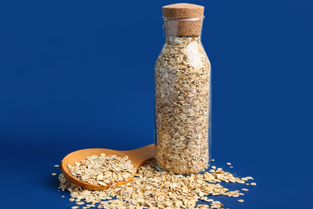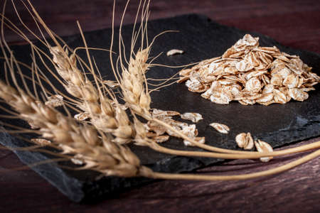 dry oat flakes in a spoon and ears of wheat on a blue background. the concept of natural healthy food.