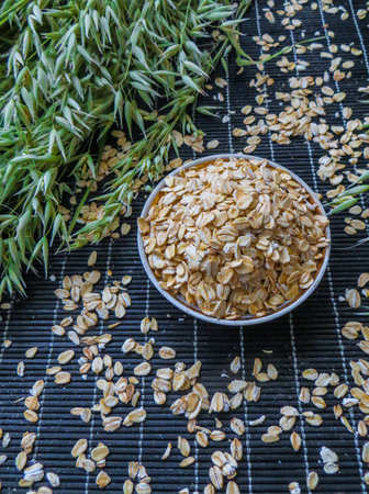 Ears of oats and oatmeal, whole grains in bowl on table. Uncooked grains for oatmeal porridge