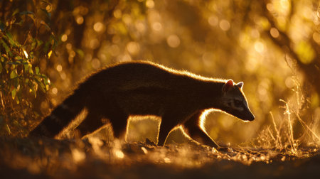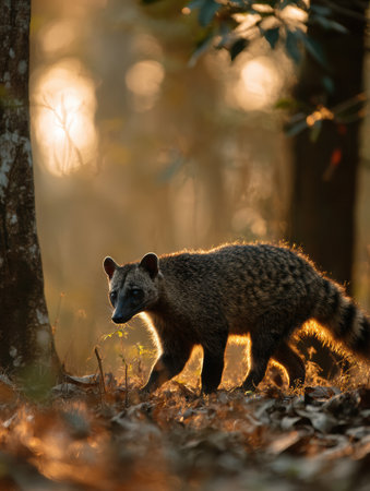 An African civet roams in golden light, exploring the forest as sunlight enhances its unique features.