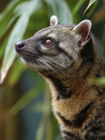 Profile of a golden civet against a blurred bamboo backdrop highlights its sharp features and natural curiosity in a serene, wooded setting.