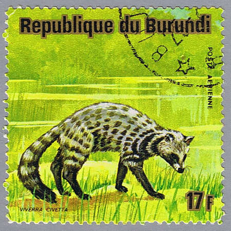 REPUBLIC OF BURUNDI - CIRCA 1975: A stamp printed in Republic of Burundi shows African civet, series, circa 1975