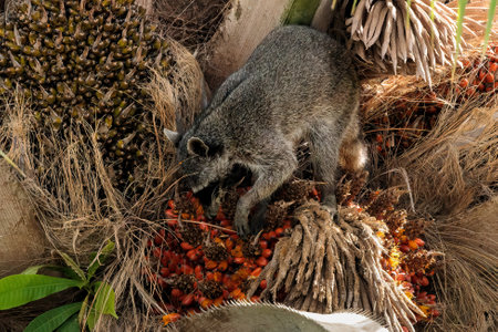 Horizontal sunny nature background with Asian Palm Civet (Civet cat). Produces Kopi luwak. Luwak Coffee is world most expensive coffee. Copy space for text