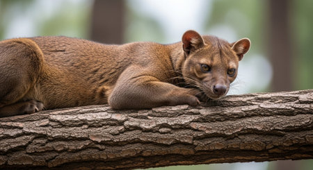 Captures an intense gaze of a fossa with striking amber eyes, highlighting detailed fur textures and unique facial features against a soft dark background.