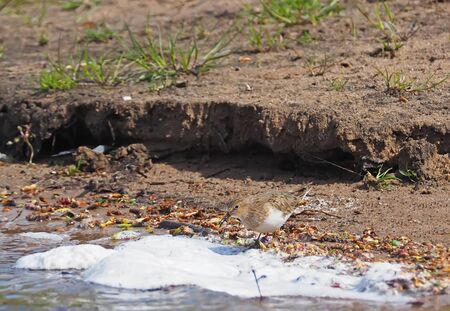 Little Bird Sandpiper looking for food on the shore of the river Kazanka. Kazan, Russia. The Baird's sandpiper (Calidris bairdii) is a small shorebird.