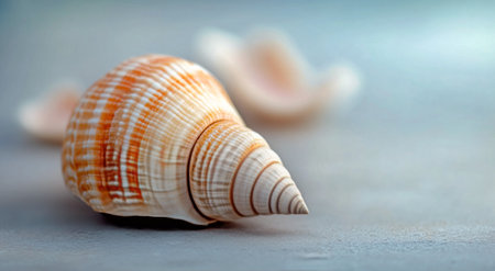 A detailed spiral seashell displays intricate patterns and textures, resting on a smooth surface with soft, diffused lighting highlighting its colors and shape.