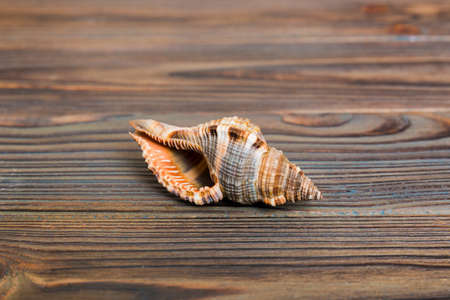 Close up of a sea shell on a wooden table. Top view.