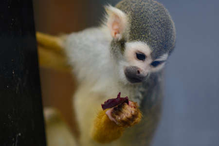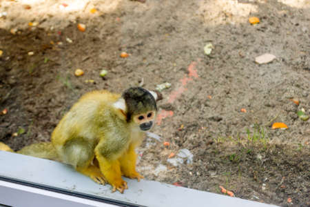 A small monkey of the Bolivian saimiri sits near the window and looks at people who came to the Novosibirsk zoo to look at the beasts