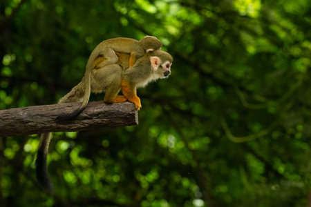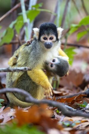 common squirrel monkey with a infant on her back eating food in a tree, tropical animal specie from the amazon basin of America