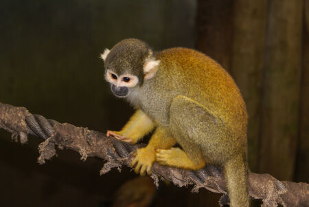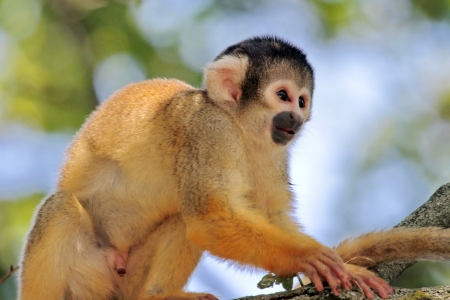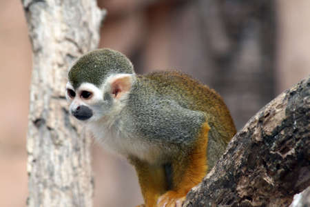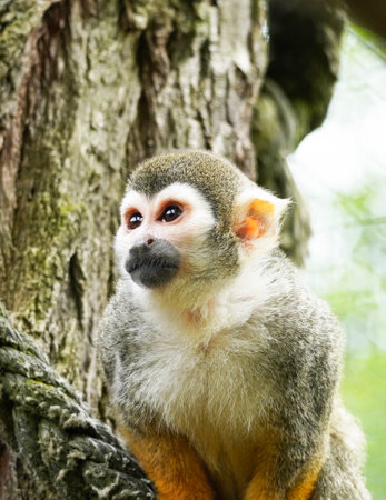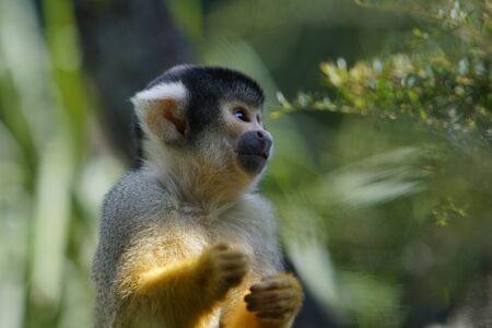 Portrait of squirrel monkey Saimiri sciureus sitting on a tree branch.