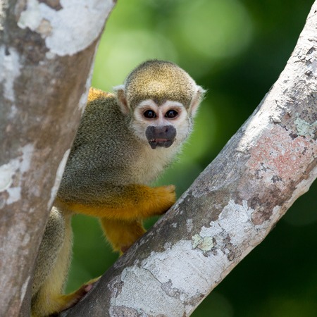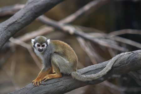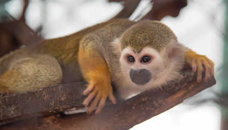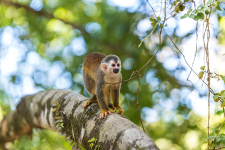 Squirrel monkey sitting on a tree branch and looking at the camera