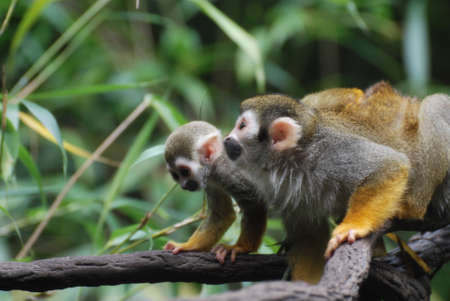 Common squirrel monkey, Saimiri sciureus, a species of squirrel monkey from Guiana, Venezuela and Brazil. Animals watching