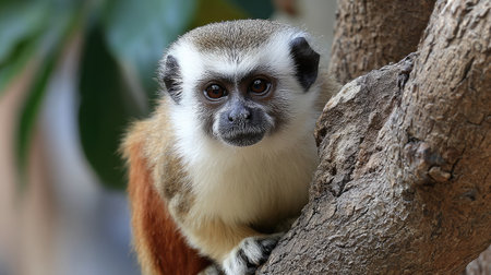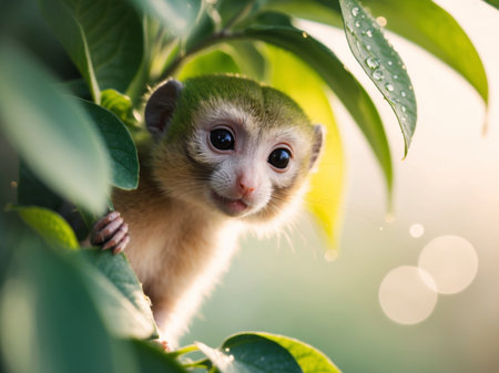 AI Generated. Marmoset Peeking Through Leaves in Soft Morning Light
