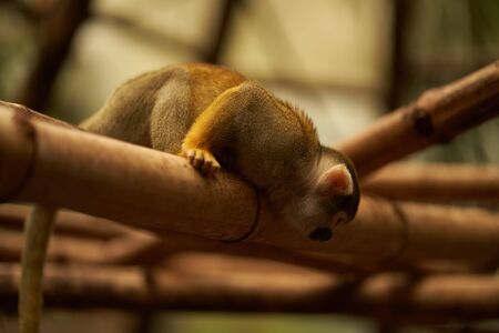 a squirrel monkey perched on a tree branch. Monkeys in their enclosure at the zoo. An animal in captivity.