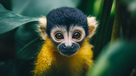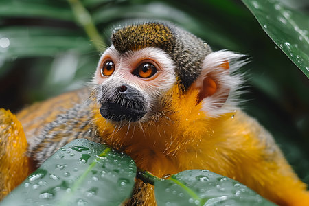 Detailed close-up of a squirrel monkey amid lush green foliage with dewdrops. the monkey's expressive eyes and vibrant fur create a captivating and intimate wildlife scene, ideal for nature-themed projects, educational materials, or wildlife photography collections. Generative AI