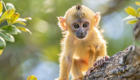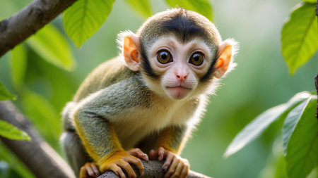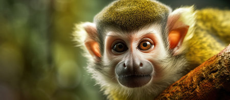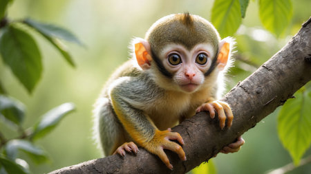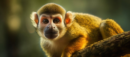 A close-up shot of a squirrel monkey perched on a tree branch with a blurred bokeh background, symbolizing wildlife, nature, and the beauty of animals in their natural habitat.