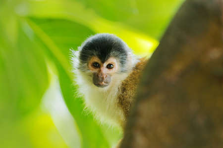 Monkey, long tail in tropic forest. Squirrel monkey, Saimiri oerstedii, sitting on the tree trunk with green leaves, Corcovado NP, Costa Rica. Monkey in the tropic forest vegetation. Wildlife nature.