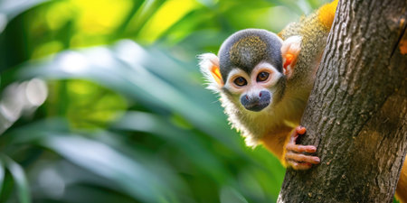 Inquisitive Squirrel Monkey Peeking Around a Tree in a Lush Green Forest