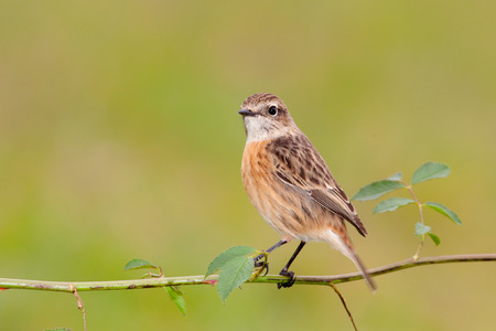 Female Eastern Stonechat (Saxicola rubicola) perched on a branch