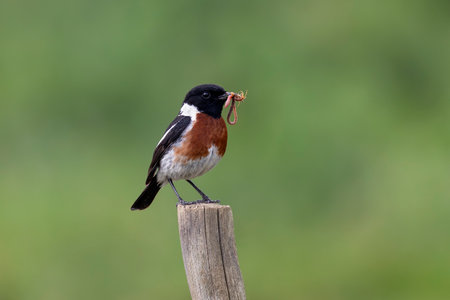 African Stonechat perched on a post with worms in its beak in Malgas, South Africa