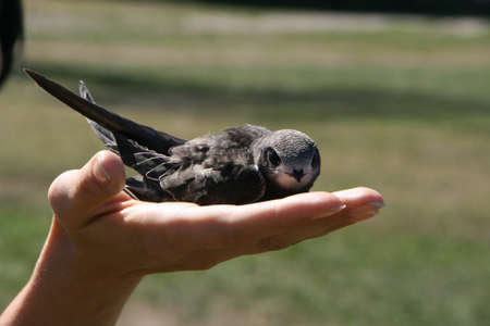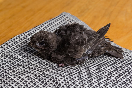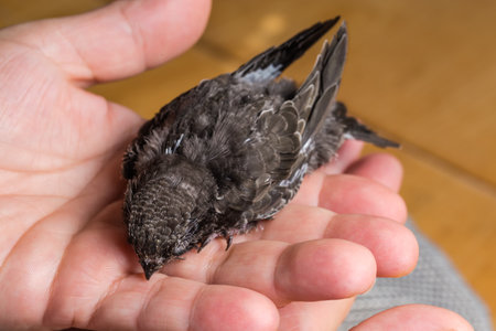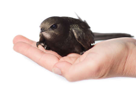 Not fully fledged nestling of black swift that was fallen out of the nest and handpicked for salvation in home conditions