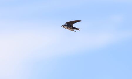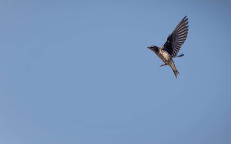 Flying purple martin Progne subis bird across a blue sky in Naples, Florida in spring.