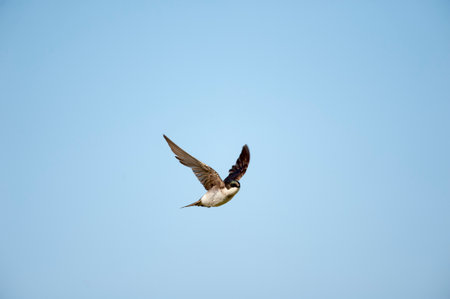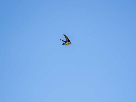An asian house martin, Delichon dasypus, flies across blue skies while hunting for insects over the Sakai River on a fine spring day.