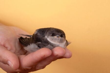 Bird, a young defenseless swift chick sits in a man's hand, a concept of trust and defenselessness