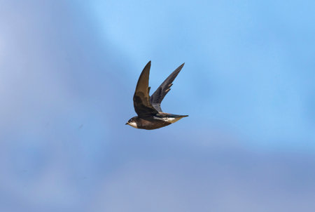 A Sand Martin gliding through the vast expanse of the sky, its agile wings carrying it with effortless grace.