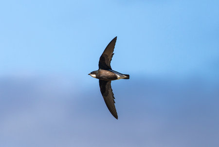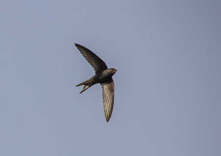 A flying common swift under blue sky