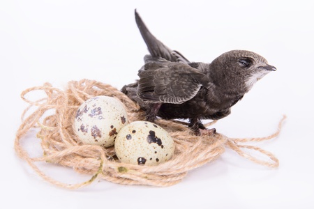 Portrait of an Young Eurasian Swift, in a bird's nest with eggs, isolated on white background