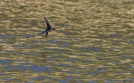 Common swallow in flight doing pirouettes on the water.