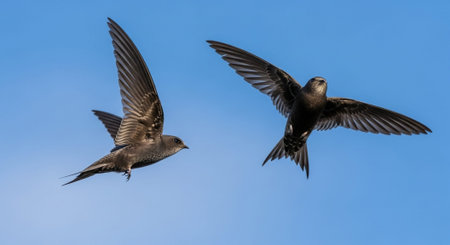 Beautiful synchronized flight of the flock of black swifts. Common Swift (Apus apus) hunt insects collectively.