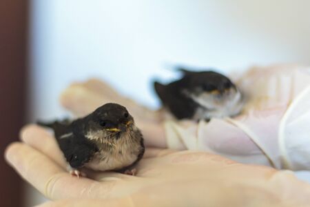 Hands holding two baby swallows. Focus on the first bird