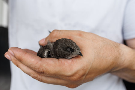 Not fully fledged nestling of black swift that was fallen out of the nest and handpicked for salvation sitting on a hand in home conditions